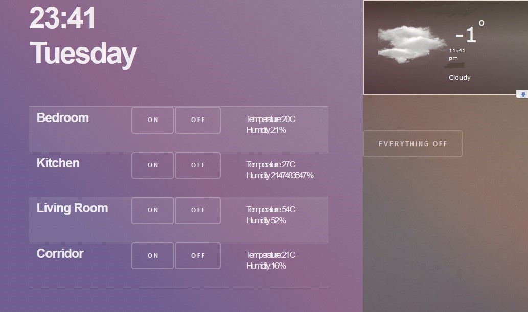 Клиентская морда состоит из html шаблона с JS, который, в свою очередь читает данные о температуре и влажности из БД, ну и включает и выключает свет, аналогичным методом.
