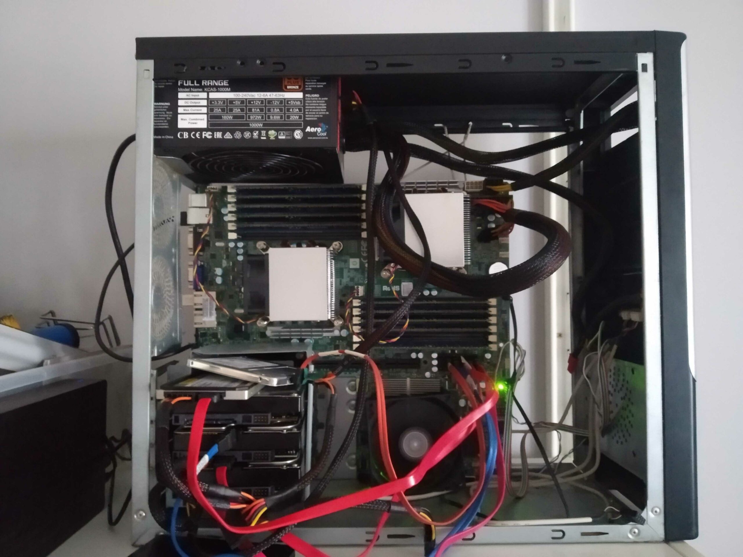 Через какое-то закончился рабочий компьютер, на котором происходила разнообразная разработка и домашние поделища. Как итог – купился нормальный сервер под видом игрового компьютера, да еще и с видеокартой. Нашим узкоглазым другом стал Supermicro X8DTU-F. Набив оперативой не под самую плашку, но достаточно, и изменив систему охлаждения на что-то более большое и гуманное для слуха, получилась отличная система виртуализации для дома. Может быть даже слишком хорошая. Отдельный плюс – это то, что можно использовать нормальный блок питания, а не серверный, что добавляет тишины.